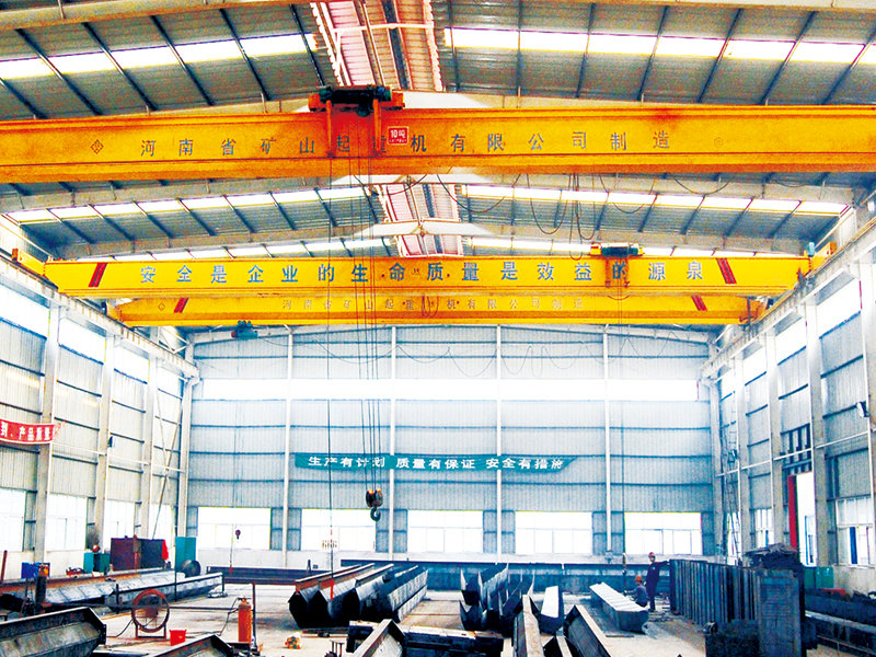 本產(chǎn)品由箱形主梁、端梁、小車及運(yùn)行機(jī)構(gòu)組成,電動葫蘆安裝在角型小車上作為起升機(jī)構(gòu),角型小車采用偏掛形式布置在主梁一側(cè)運(yùn)行,小車設(shè)有上、下水平輪,與垂直行走輪呈三點(diǎn)布置。電動葫蘆位置由傳統(tǒng)的主梁下提升到主梁上側(cè),有效提高了起升高度。
